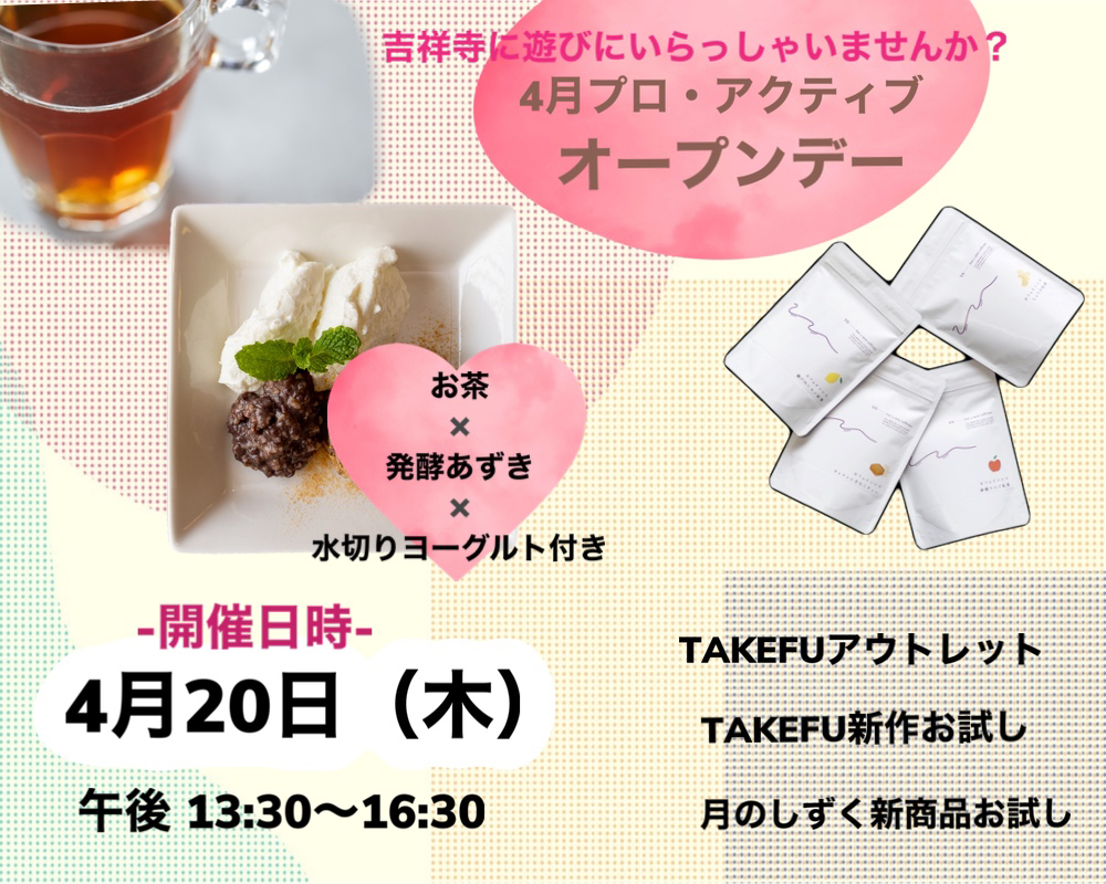 2023年4月「プロ・アクティブ OPENDAY」 2023年4月20(木) 13:30~16:30 久しぶりに開催します! 春の陽気に誘われて吉祥寺まで遊びにいらっしゃいませんか? プロ・アクティブ会員誌「健幸の扉」でもご紹介している、TAKEFUの新インナーやトップス、... -